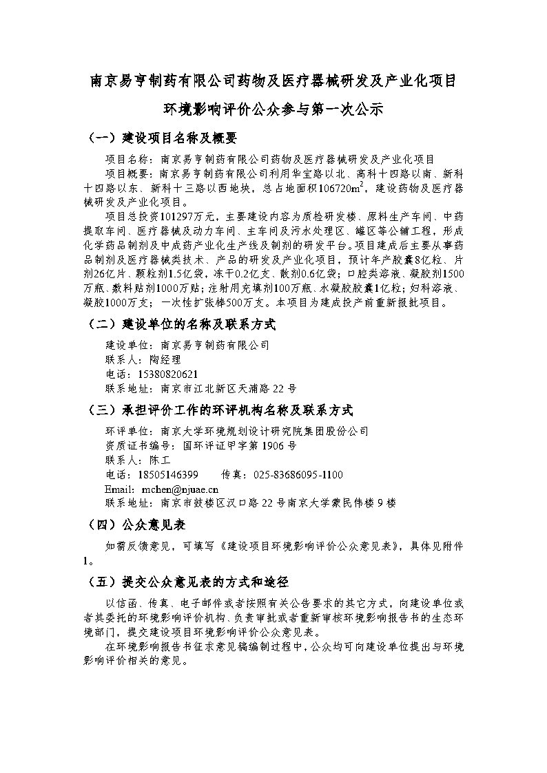 藥物及醫(yī)療器械研發(fā)及產(chǎn)業(yè)化項(xiàng)目 環(huán)境影響評(píng)價(jià)公眾參與第一次公示